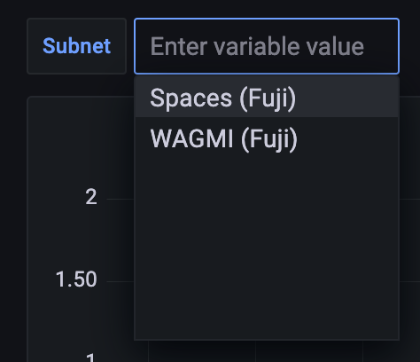 To configure the dashboard and add any Layer 1s that your node is syncing, you will need to edit the dashboard. Select the dashboard settings icon (image of a cog) in the upper right corner of the dashboard display and switch to Variables section and select the subnet variable. It should look something like this: