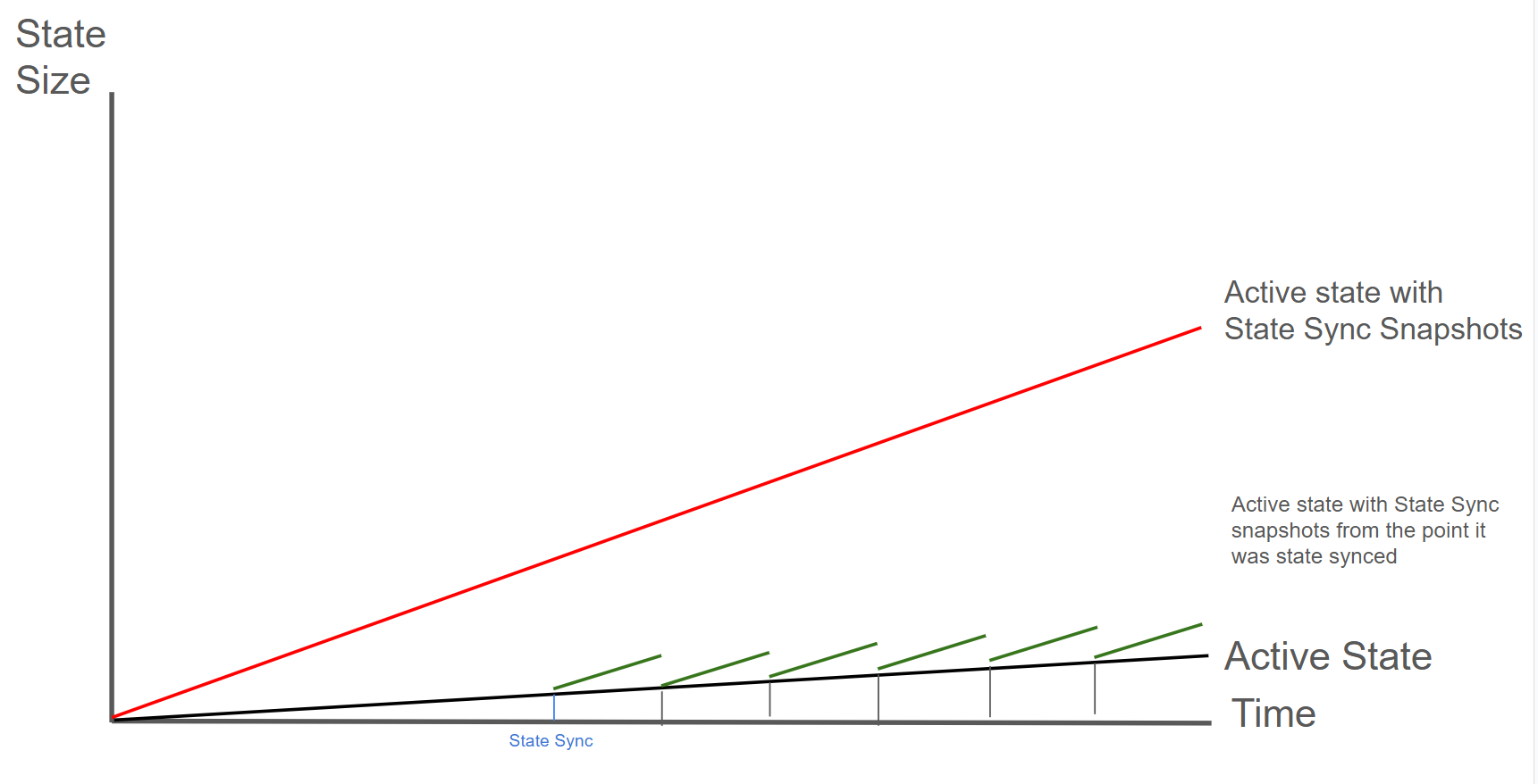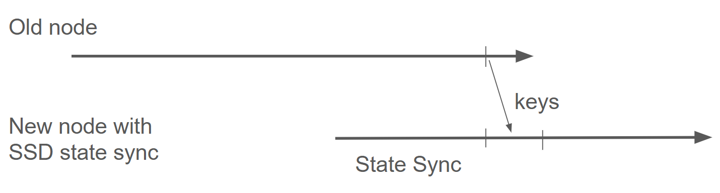 The diagram shows the process: stop the old node, let a new node state sync, then transfer the staking keys to continue validating with a fresh database.