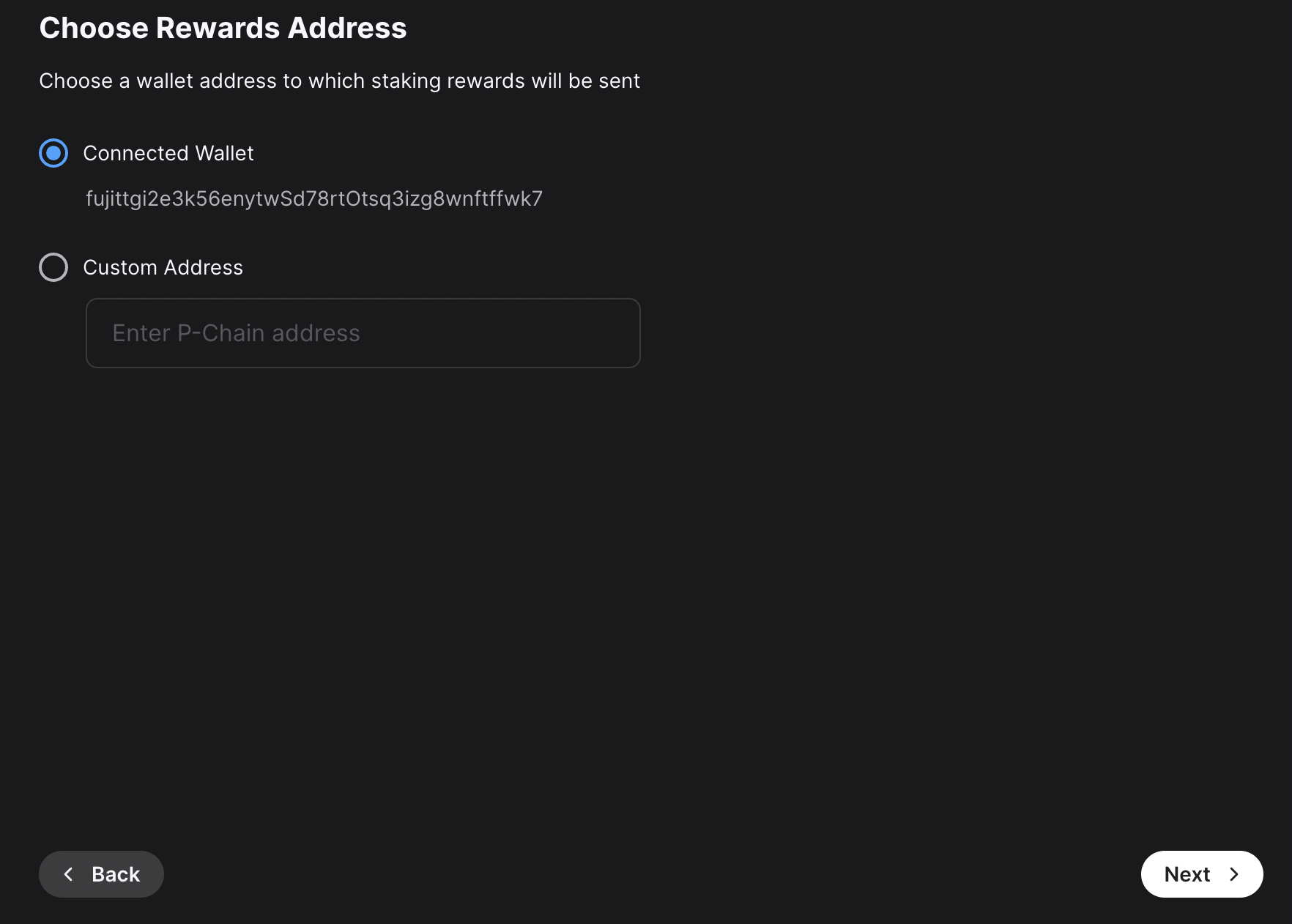 Choose the address that the network will send rewards to. Make sure it's the correct address because once the transaction is submitted this cannot be changed later or undone. You can choose the wallet's Platform-Chain address, or a custom Platform-Chain address. After entering the address, click Next.