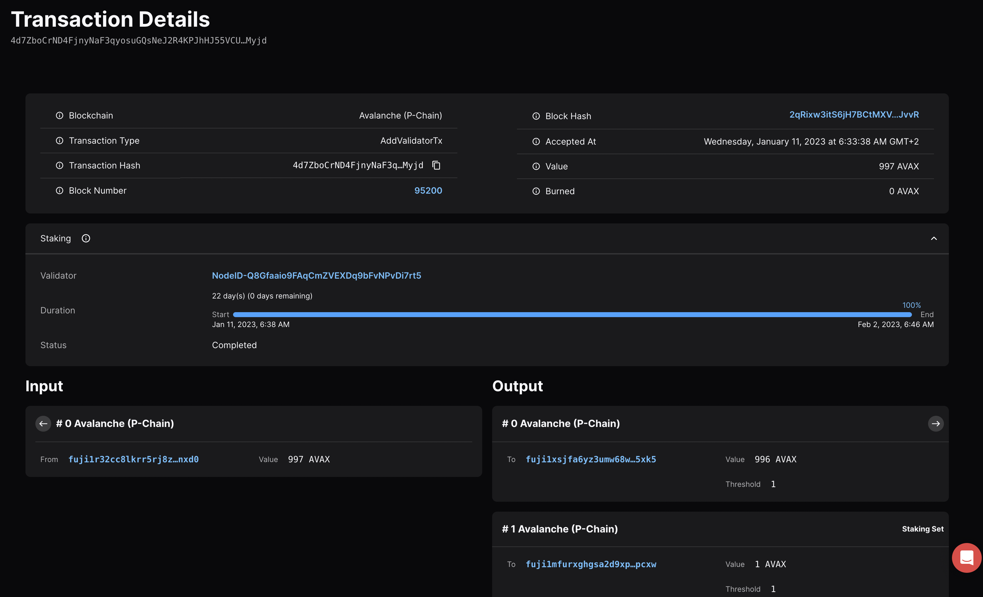 If you click on View on explorer, a new browser tab will open with the details of the AddValidatorTx. It will show details such as the total value of LUX transferred, any LUX which were burned, the blockchainID, the blockID, the NodeID of the validator, and the total time which has elapsed from the entire Validation period.