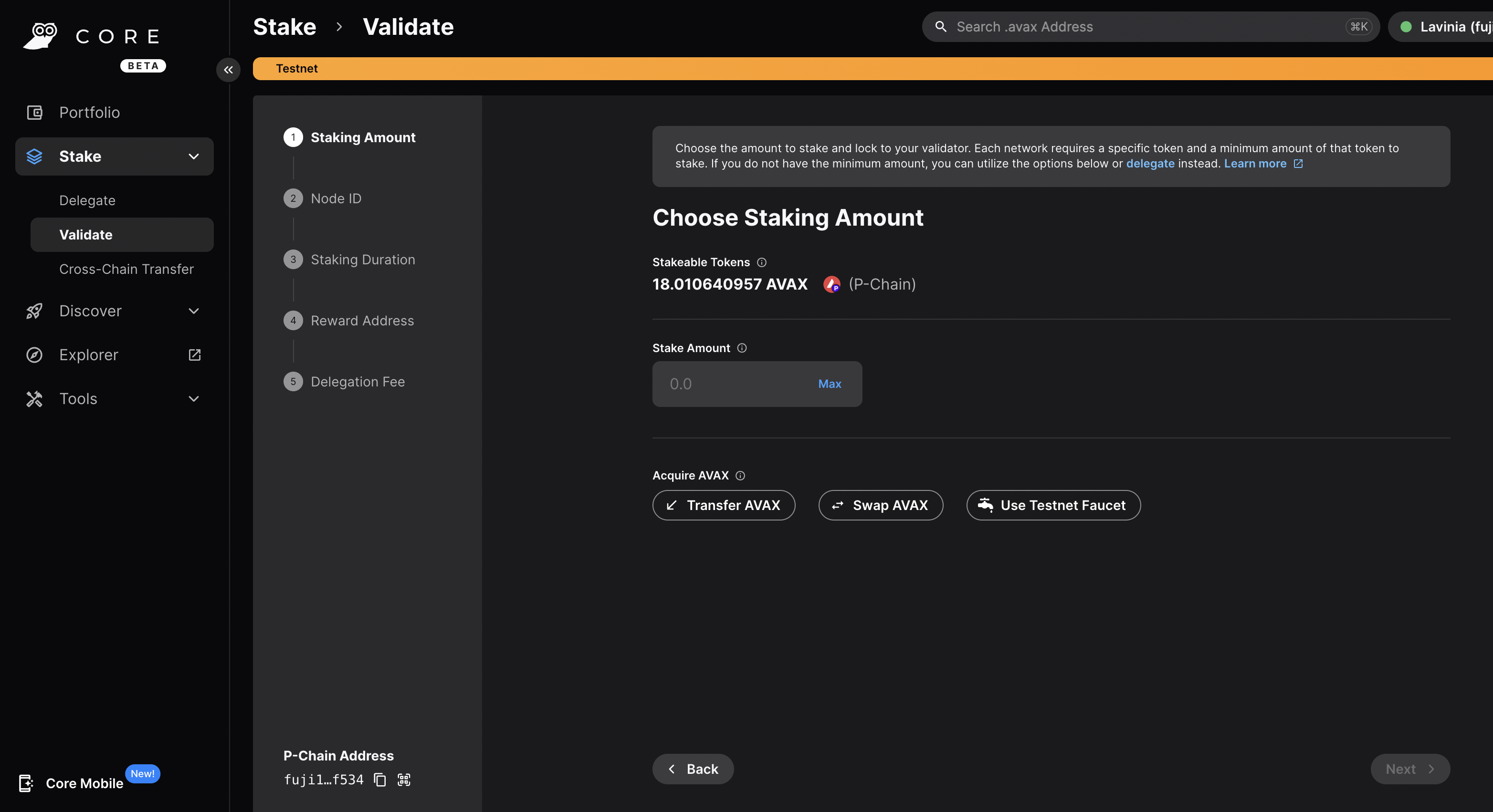 For adding the new node as a Validator on the Testnet testnet's Primary Network you can use the Core web connected to Core extension. If you don't have a Core extension already, check out this guide. If you'd like to import an existing wallet to Core extension, follow these steps.