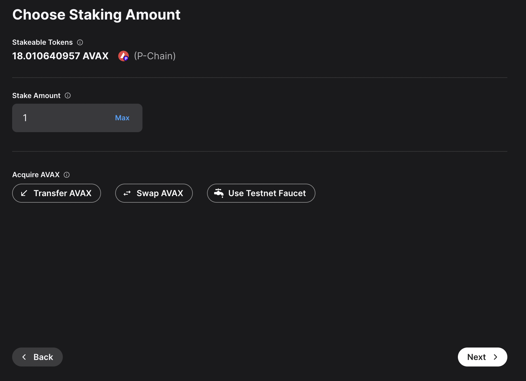 - Stake Amount: The amount of LUX to lock for staking. On Mainnet, the minimum required amount is 2,000 LUX. On Testnet the minimum required amount is 1 AVAAX.