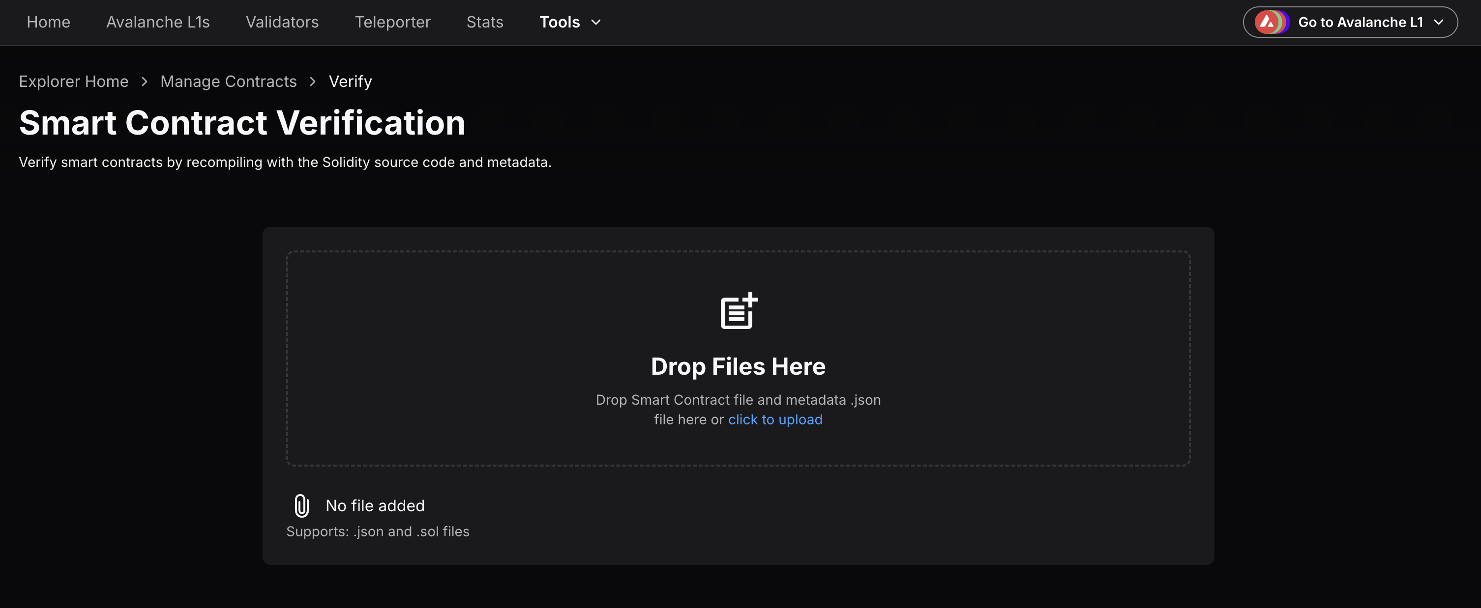 - Navigate to the official Lux Explorer and click on Tools dropdown menu to select Smart Contract Verification interface. You may need to open the Testnet Explorer in case the contract is deployed on Testnet Testnet.