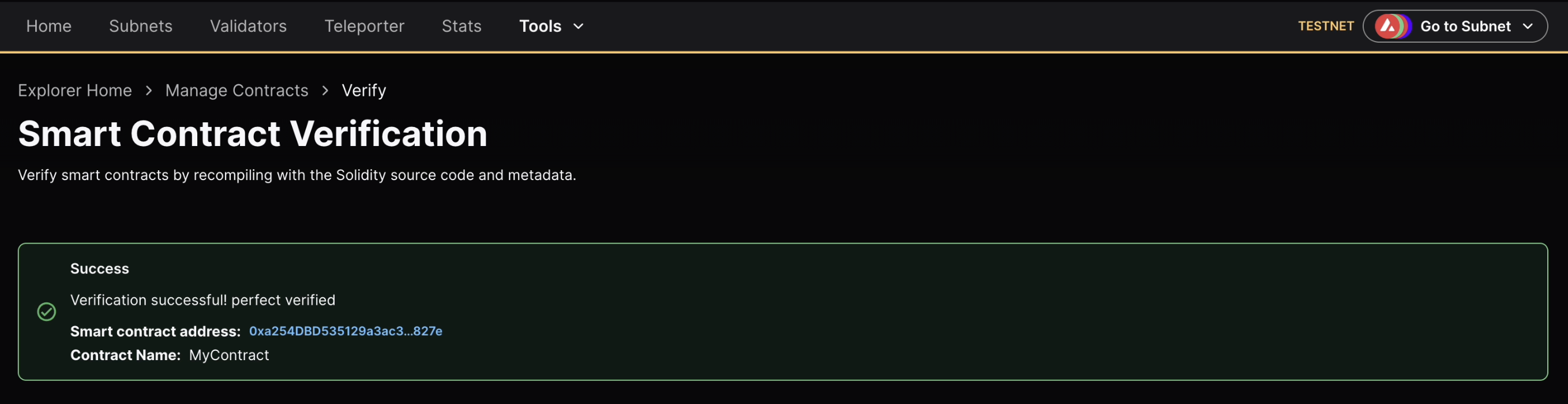 After submitting the contract for verification, your request will be processed shortly and you will see the below message.